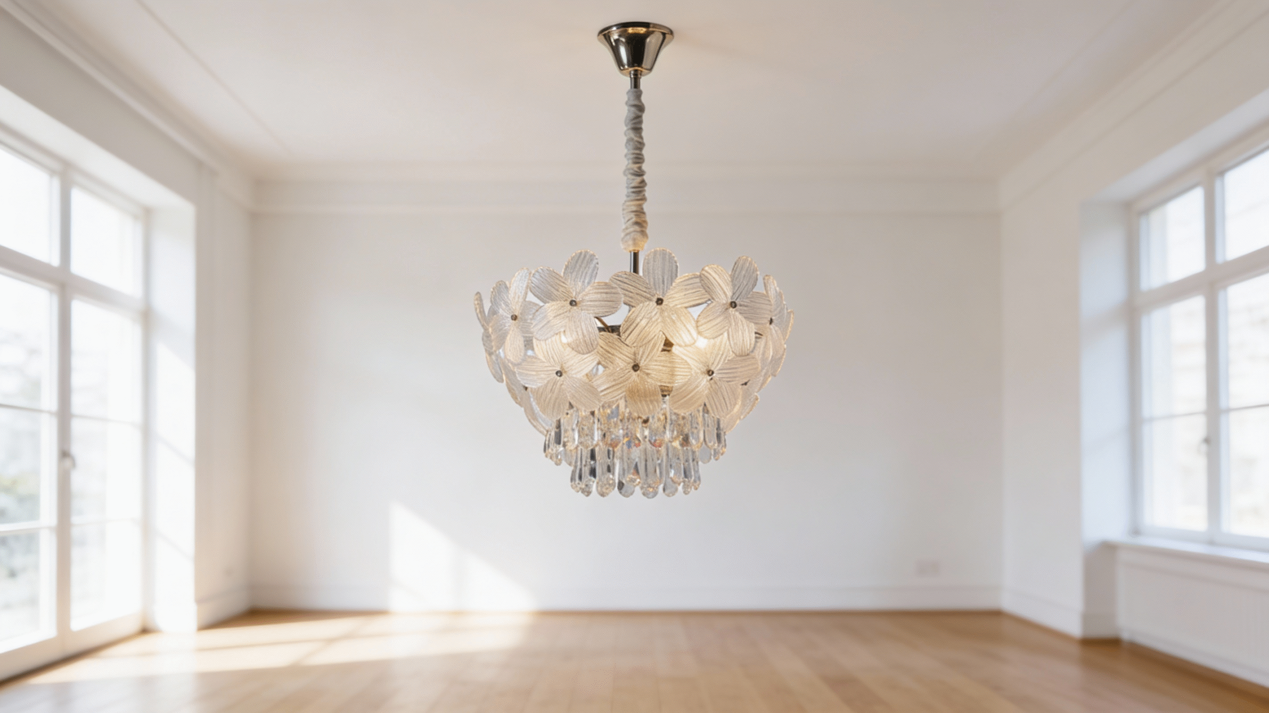 “أضف لمسة من الفخامة  إلى منزلك مع هذه الثريا الكريستالية الساحرة بقياس 50 سم. تصميم فريد يجمع بين أناقة الكريستال المتلألئ وجمالية الزهور المتفتحة، لتنشر إضاءة دافئة وساحرة تضيء مساحتك ببريق لا مثيل له. قطعة فنية راقية تليق بمدخلك أو صالونك، لتخلق أجواءً من الأناقة الخالدة.”